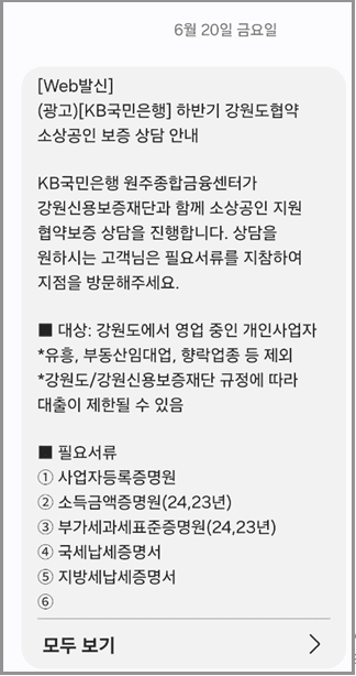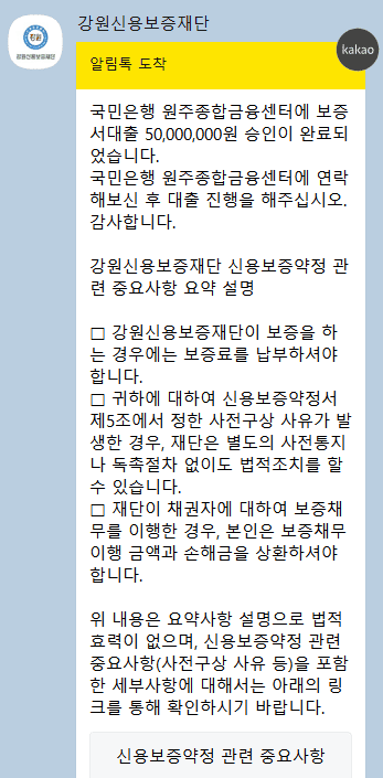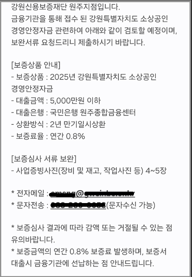 내용은 ‘강원신용보증재단을 통한 5천만원 보증 신청이 가능하니 방문’하는 안내였죠.