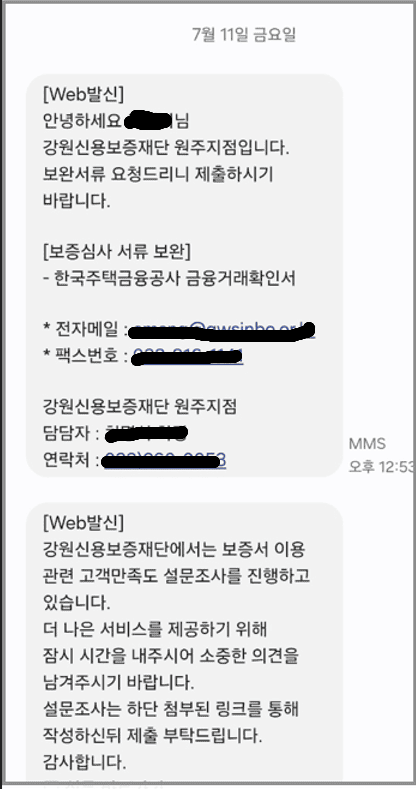 보증 진행을 위한 추가 서류를 요청했고, 관련 문자를 아래와 같이 받았습니다.