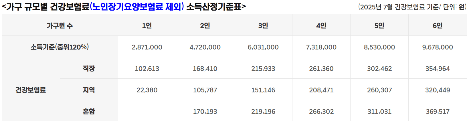 - ④ 가구 소득이 중위소득 120% 이하 (2025년 7월 건강보험료 기준)
