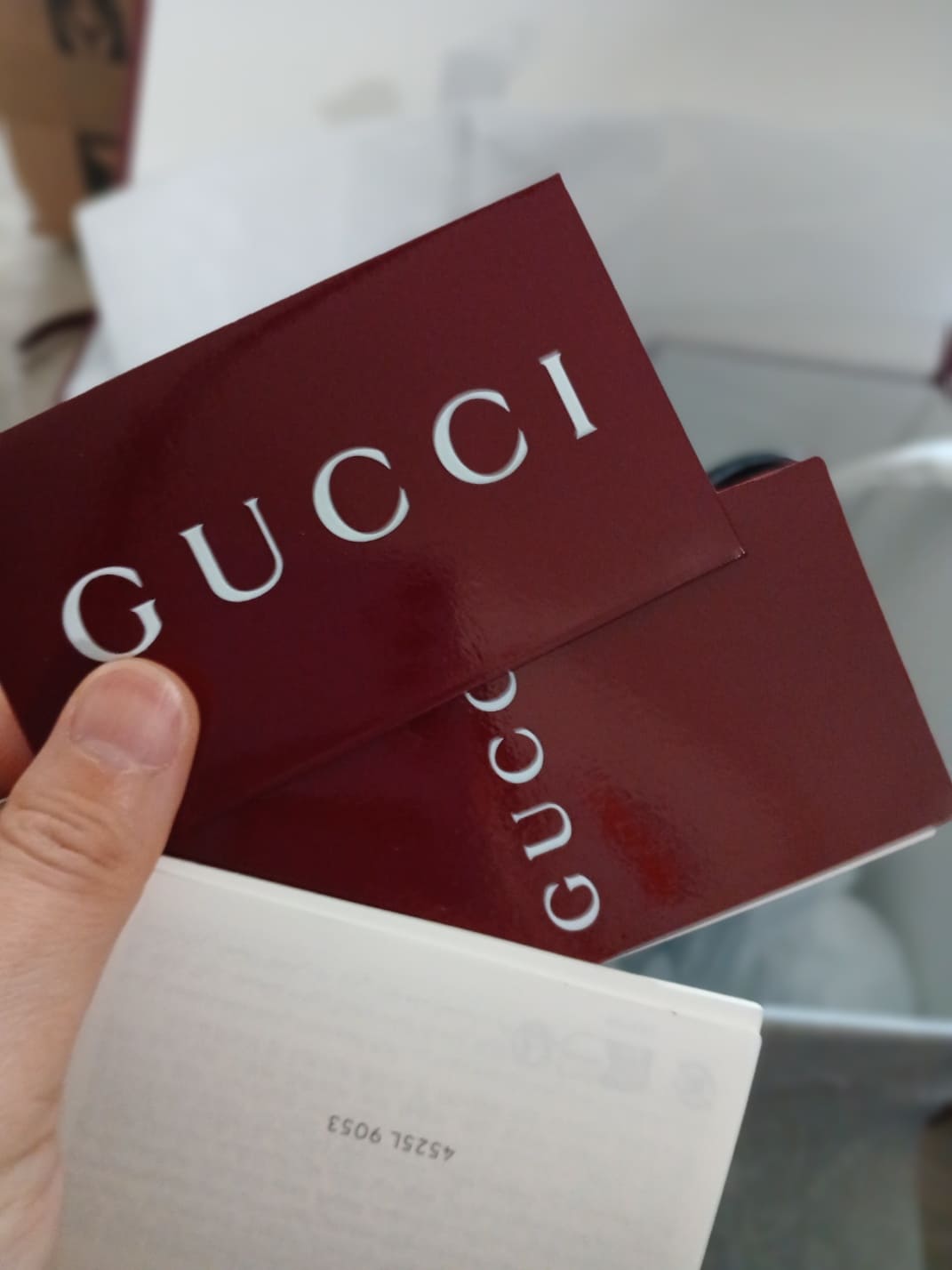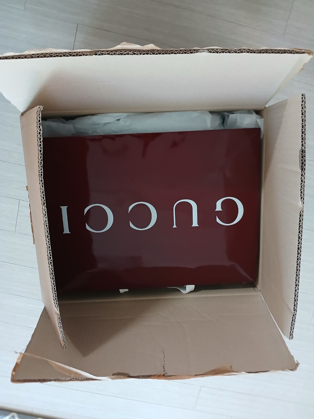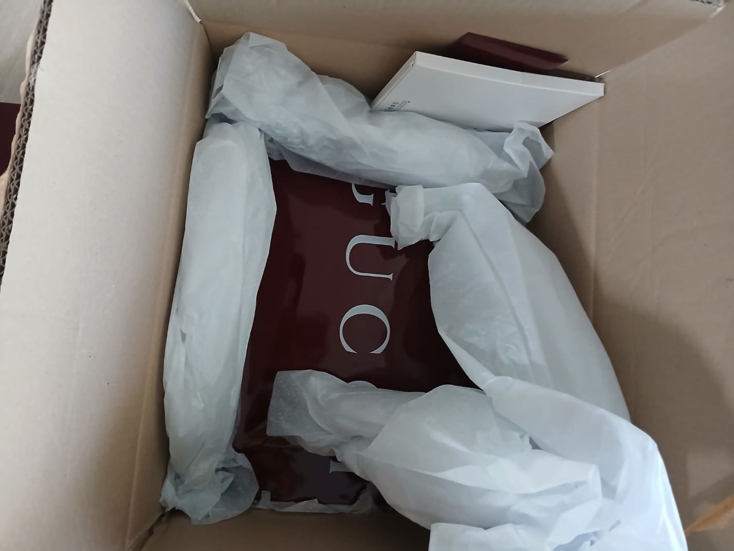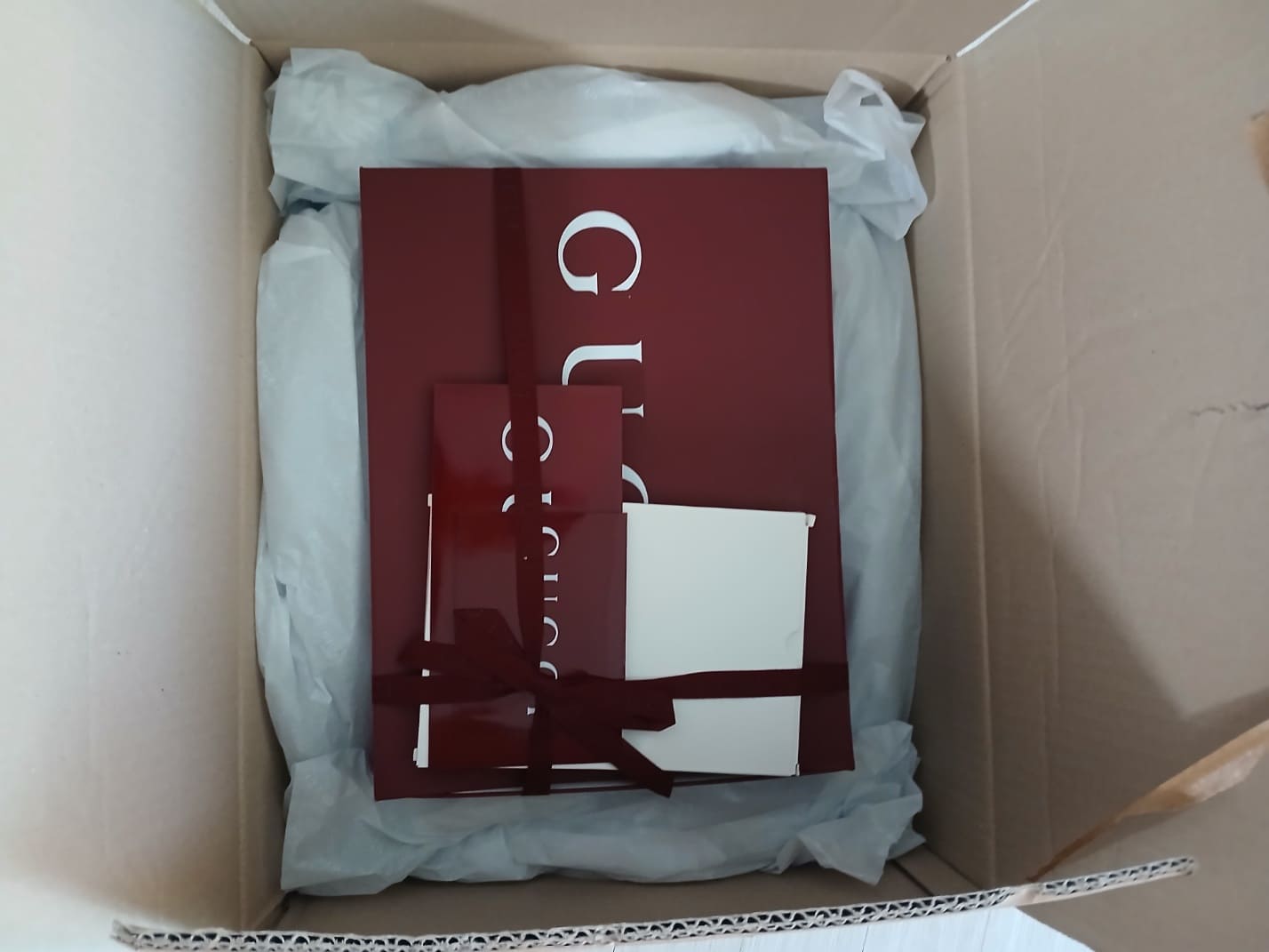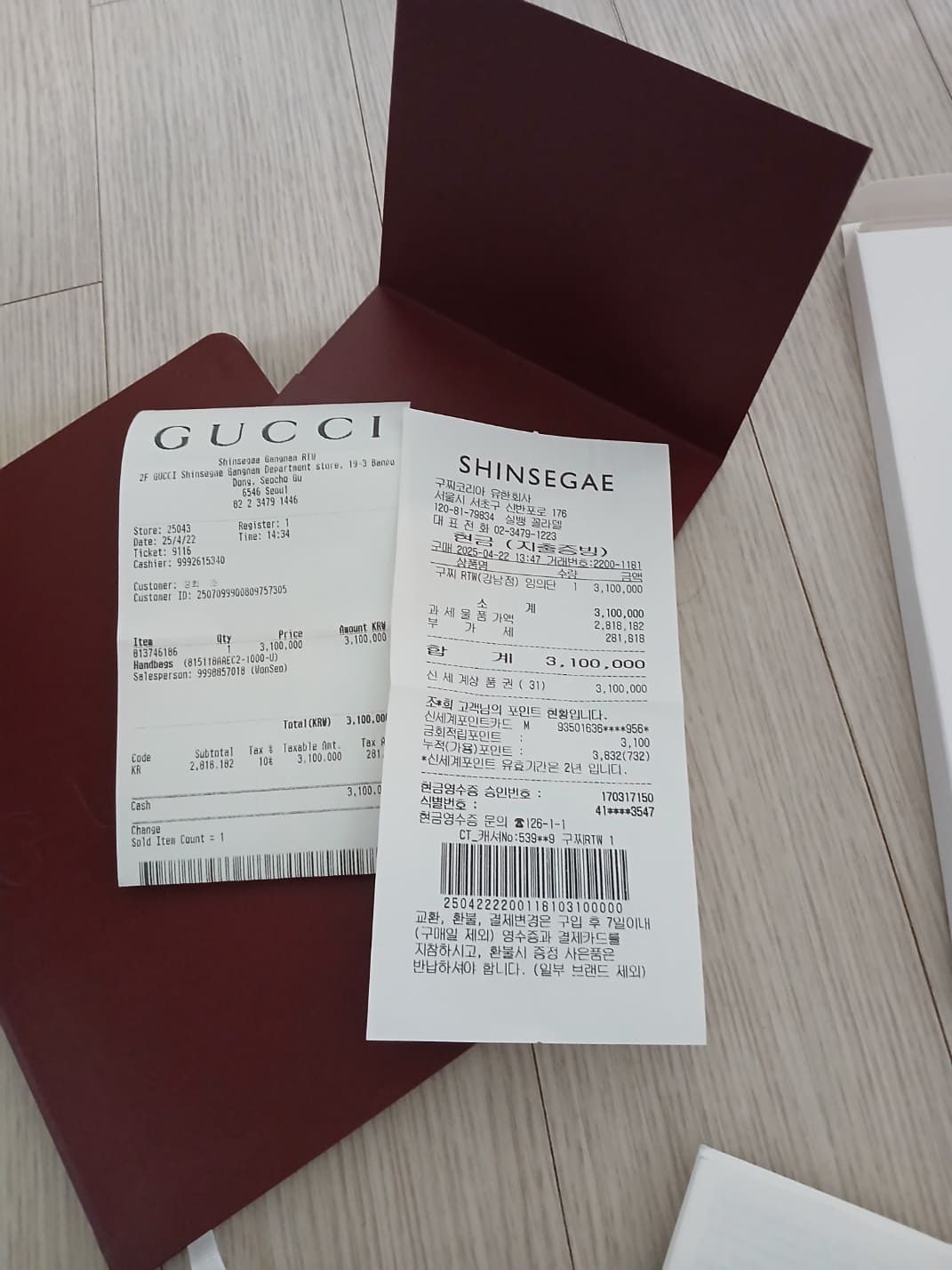 내부에는 구찌의 시그니처 와인 컬러 쇼핑백과 케어카드, 정품 인증서가 세심하게 포장되어 있었어요.