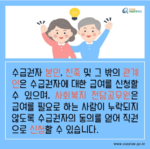 · 대리인은 수급권자의 가족(친족)또는 그 밖의 관계인이 될 수 있습니다.