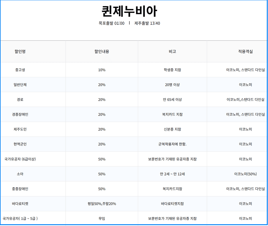 제주로 떠나는 여객선 여행, 할인 혜택은 무조건 챙겨야겠죠? 오늘은 씨월드고속훼리에서 운영하는 퀸제누비아호 1호와 2호의 할인정보를 비교해보고, 차이점까지 한눈에 정리해드립니다.