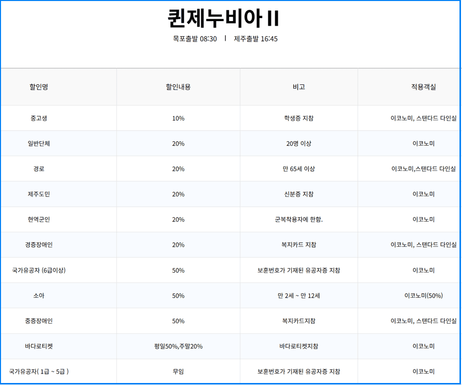 여행 일정, 아침 출발 여부, 좌석 선호에 따라 퀸제누비아호 1호 또는 2호를 선택해 보세요. 제대로 된 할인 정보를 알고 있으면, 더 알뜰한 제주 여행이 가능합니다!