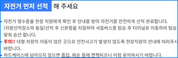 - 자전거 선적 장소는 대형 차량이 많이 오가는 구역입니다. 반드시 현장 직원의 안내에 따라주세요.