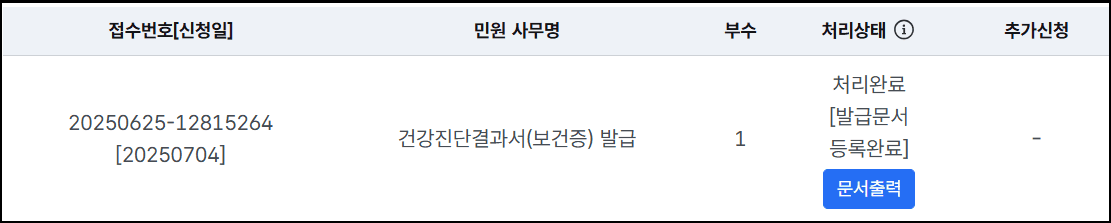 신청 후에는 나의 신청내역 페이지에서 ‘문서출력’ 버튼을 통해 보건증을 인쇄할 수 있습니다.
