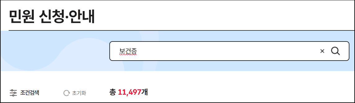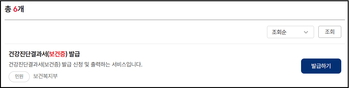 상단 검색창에 ‘보건증’을 입력하면 총 6개의 관련 민원이 검색됩니다.