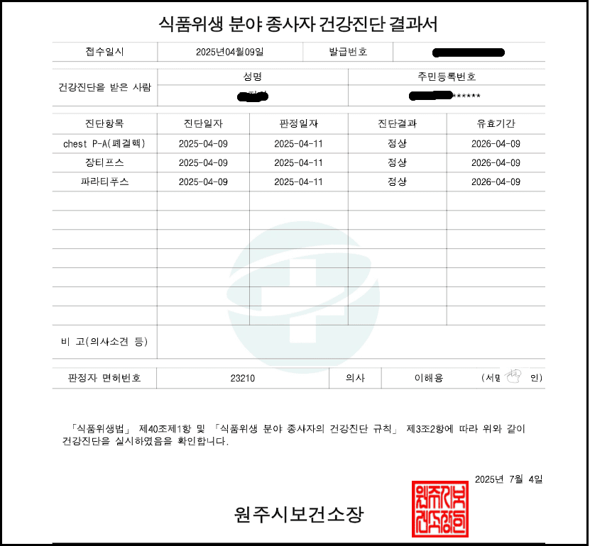 보건증(건강진단결과서)은 식품위생 분야 종사자라면 반드시 소지해야 하는 필수 서류입니다.