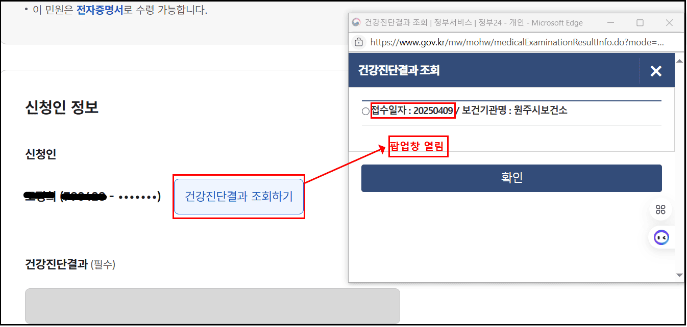 팝업창이 열리면 본인이 접수했던 날짜와 보건기관명이 확인되며 원하는 날짜의 정보를 체크후 확인 버튼을 클릭합니다.