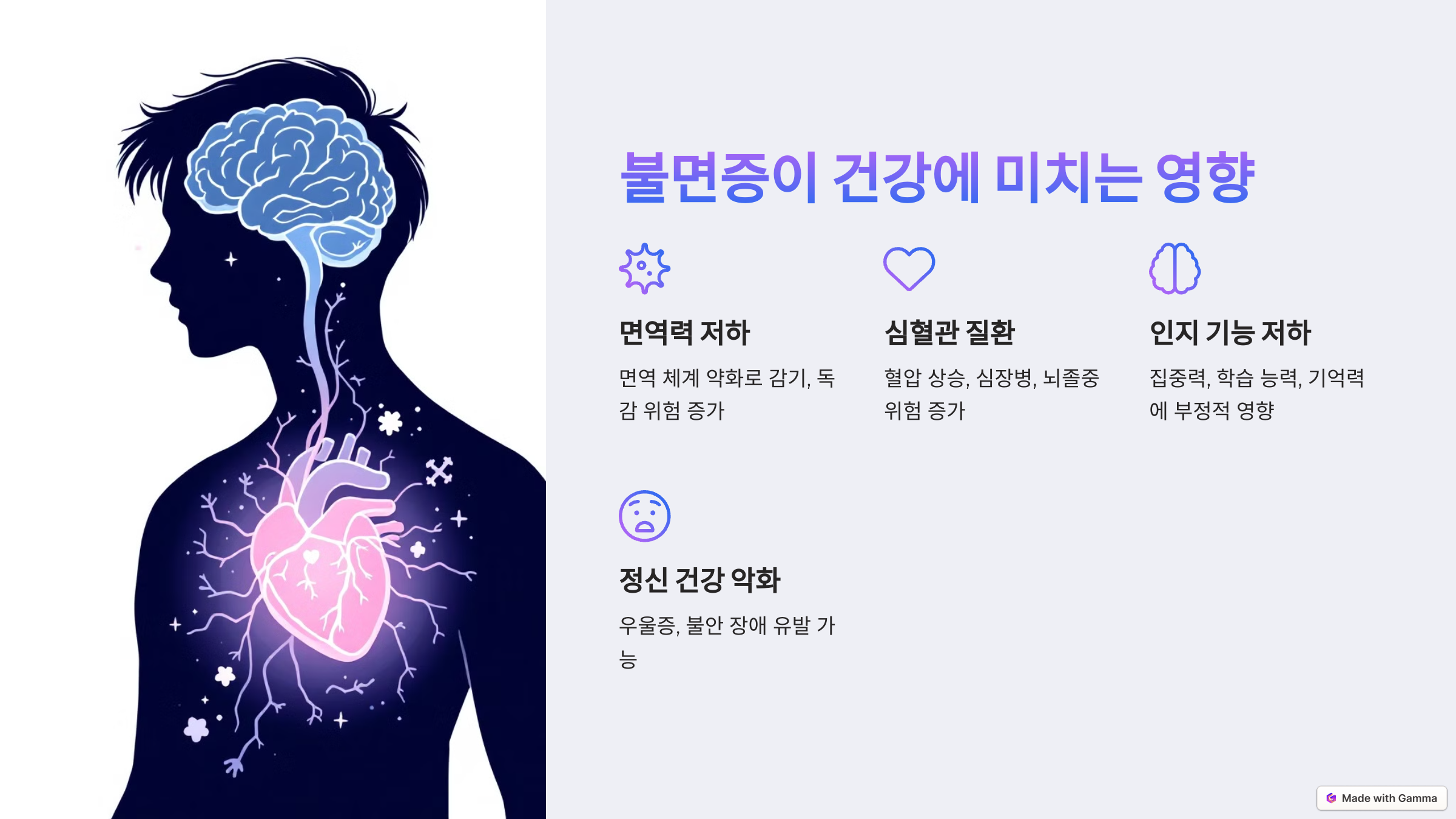 불면증은 단순히 피로감을 느끼는 것 이상으로 우리의 건강에 심각한 영향을 미칠 수 있습니다. 특히 장기간 지속될 경우 신체적, 정신적 건강에 다양한 부정적인 효과를 초래할 수 있습니다.