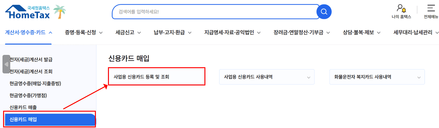 ① 홈택스 접속 후 → [계산서·영수증·카드] → [신용카드 매입] → [사업용 신용카드 등록 및 조회] 메뉴로 이동합니다.
