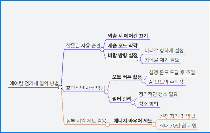 짧은 외출 시 끄지 않기, 제습 모드 활용, 바람 방향 설정, 오토 모드 사용, 필터 청소, 햇빛 차단, 그리고 정부의 지원 제도(에너지바우처)를 활용하는 것이 핵심입니다.