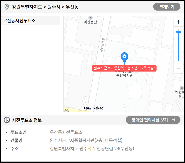 | 우산동 | 우산동사전투표소 | 원주시근로자종합복지관 2층, 다목적실 | 우산공단길 24 |