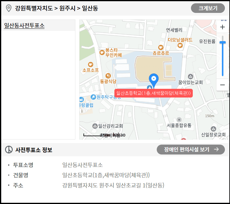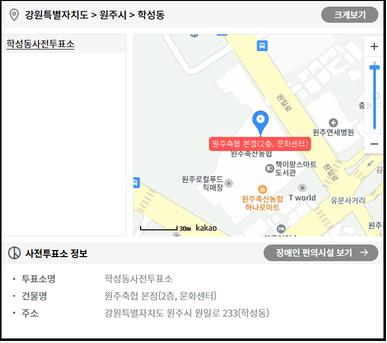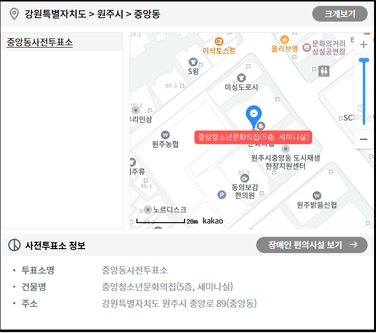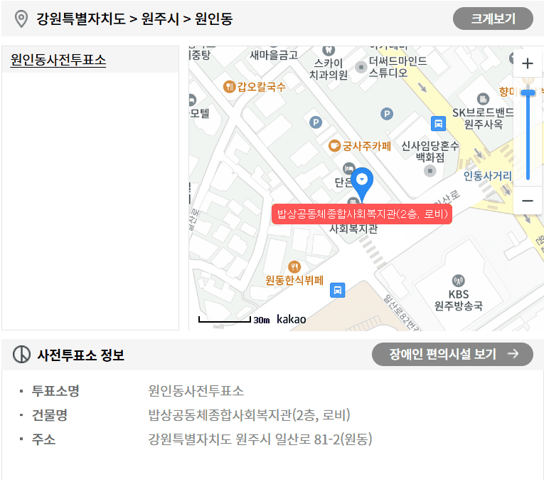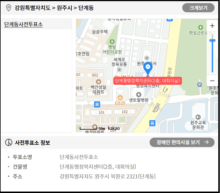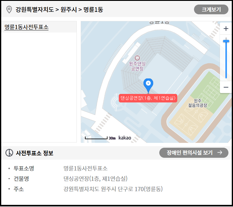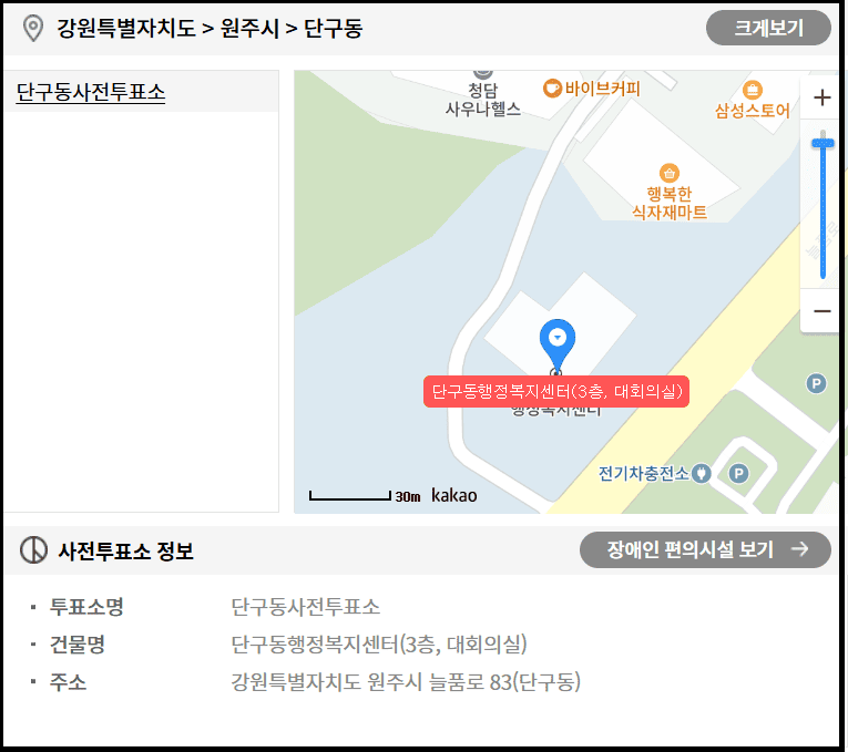 | 지정면 | 지정면사전투표소 | 서원주건강생활지원센터 2층, 운동실천교육실 | 가곡로 75-2 |