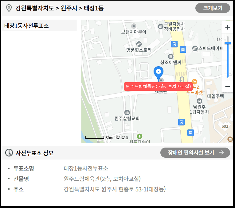 | 태장1동 | 태장1동사전투표소 | 원주드림체육관 2층, 보치아교실 | 현충로 53-1 |