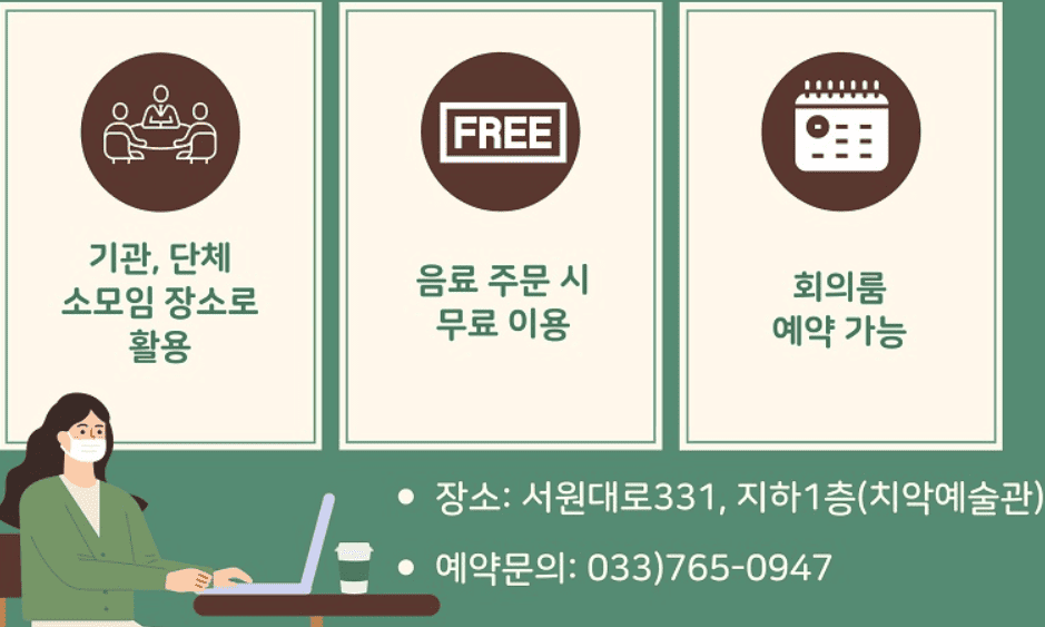 원주에서 조용히 책 읽고 싶은 날, 대화가 방해받지 않는 공간이 필요할 때가 있죠? 치악예술관 지하에 자리한 ‘카페IN 치악점’은 예술과 휴식이 만나는 매력적인 장소로, 당신의 하루를 특별하게 만들어 줄 거예요. 치악예술관에서 다양한 행사가 열리다 보니, 공연이나 전시 관람 전후로 자연스럽게 한 번씩 들르게 되는 곳이에요.