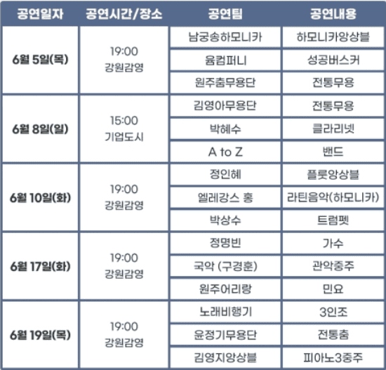 📅 공연 일정 예시: - 6.5(목) 19:00 / 강원감영 - 6.8(일) 15:00 / 기업도시 - 6.10(화) 19:00 / 강원감영 - 6.17(화) 19:00 / 강원감영 ※ 전체 일정은 위 버튼 클릭!