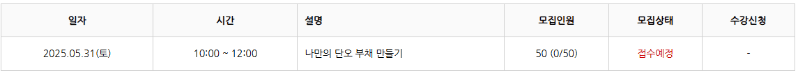 | 2025.05.31(토) | 10:00 ~ 12:00 | 나만의 단오 부채 만들기 | 50명 | 접수예정 |