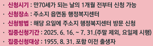 - 대상자: 만 70세 이상 원주시민 (주민등록 기준, 1955년생까지)