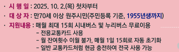 2025년 10월 2일부터 원주시에 거주하는 만 70세 이상 어르신을 대상으로, 시내버스 및 누리버스를 월 최대 15회까지 무료로 이용할 수 있는 교통지원 사업이 시행됩니다.