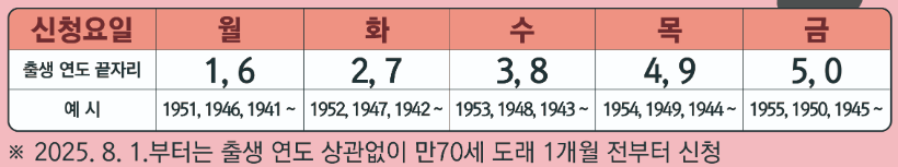 🎯 2025년 8월 1일부터는 출생연도와 관계없이, 만 70세가 되는 날 기준 1개월 전부터 신청 가능