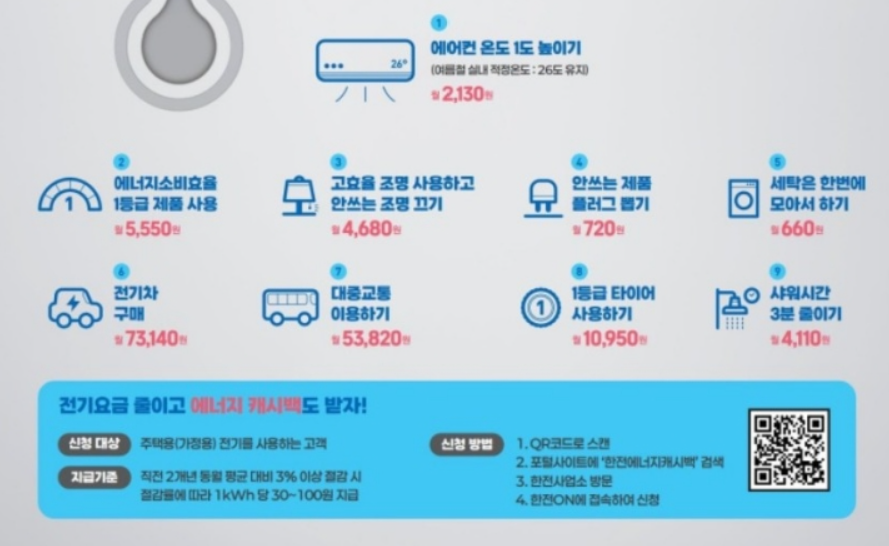 이제 절전은 개인의 선택이 아닌 ‘모두의 책임’이자 ‘혜택’입니다. 지금 바로 캐시백을 신청하고, 변화의 시작을 함께하세요!