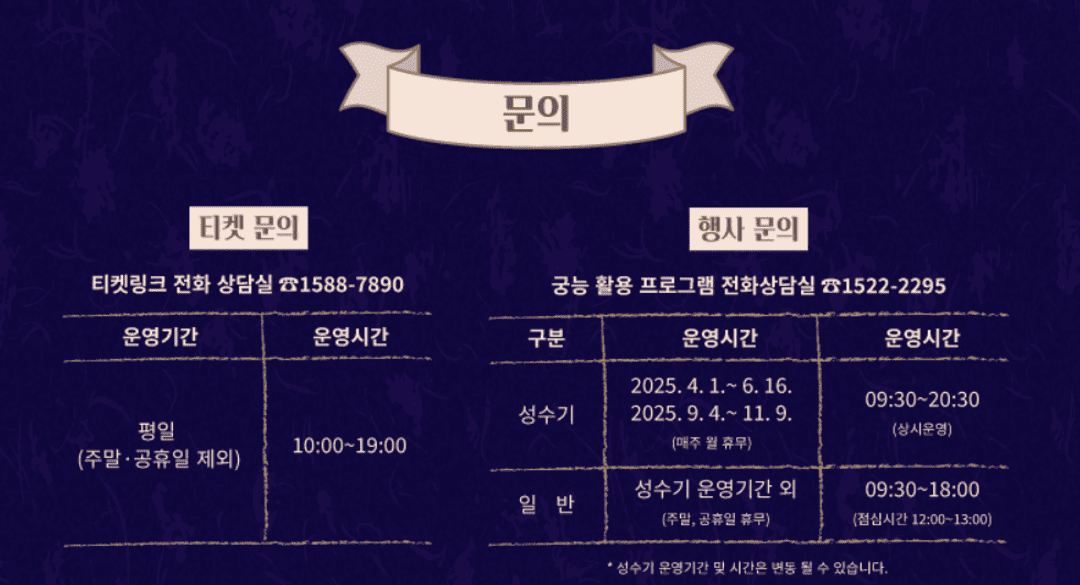 행사문의는 성수기와 일반시기에 따라 다르게 운영되니 꼭 확인하시고 궁능 활용프로그램 전화상담실(1522-2295)문의하시길 바랍니다.