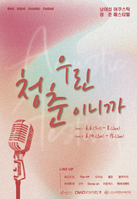 남이섬 어쿠스틱 청춘 페스티벌은 청춘 뮤지션들의 무대입니다. ‘우린 청춘이니까’라는 주제로 기획된 이번 행사는 2025년 6월 6일부터 15일까지, 열흘간 열립니다. 총 10팀의 뮤지션이 참여하며, 어쿠스틱 장르를 중심으로 잔잔하지만 깊은 감동을 선사할 예정입니다.
