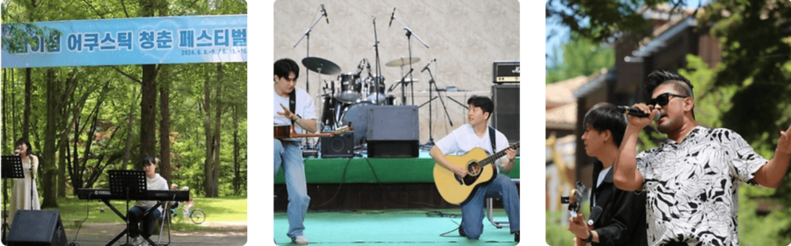 여름의 시작을 음악과 함께 특별하게 맞이하고 싶다면, 남이섬 어쿠스틱 청춘 페스티벌이 정답입니다. 청춘 뮤지션 10팀이 남이섬이라는 자연의 무대 위에서 펼치는 감성 가득한 어쿠스틱 공연! 그 순간만큼은 일상의 소음이 사라지고, 오직 음악과 자연만이 당신을 감싸줍니다.