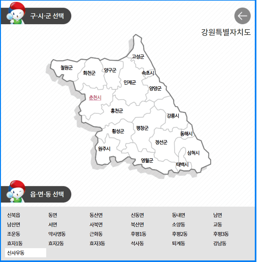 | 신사우동사전투표소 | 춘천북부노인복지관 (1층, 미소랑게이트볼장) | 춘천시 충열로 124 (우두동) |