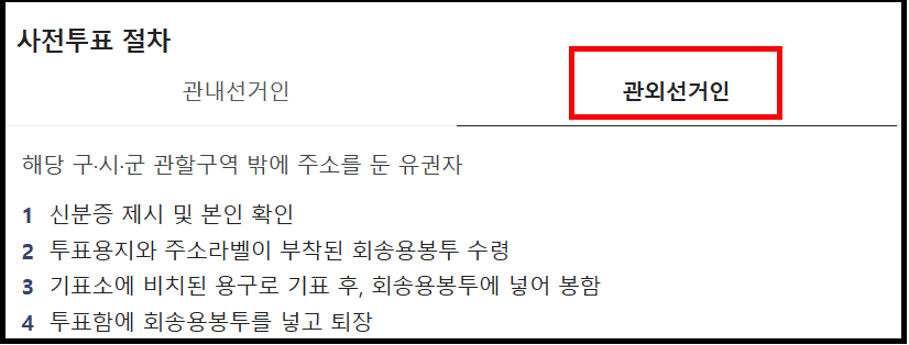 - 관외선거인: 주소지가 해당 시·군·구 밖에 있는 유권자