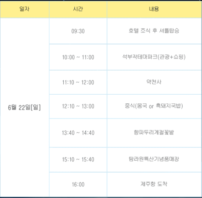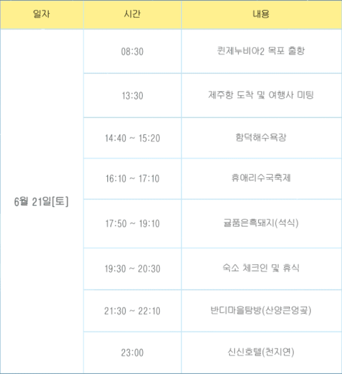 - 제주 셔틀버스 운행 - 1일차 중식: 흑돼지구이 - 휴애리 수국축제 입장권 - 반디마을 입장 및 체험 - 2일차 조식: 호텔 조식 - 2일차 중식: 국밥 |
