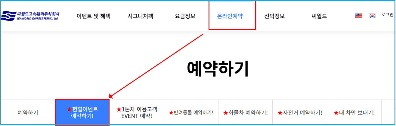 - 씨월드고속훼리 홈페이지 접속 → "예약하기" 클릭