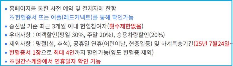 - 모바일 승선권, 신분증, 헌혈증 지참 후 개찰구에서 확인