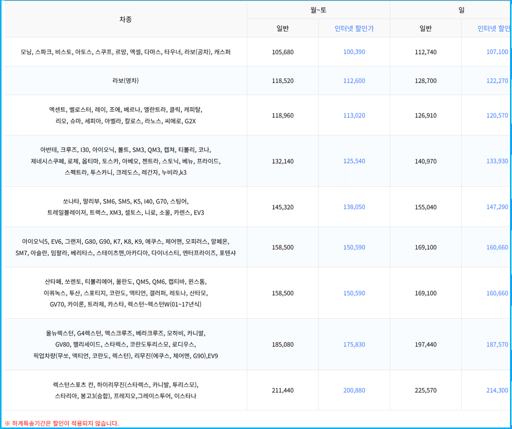 - 🚙 아반떼, K3 등 준중형 승용차: 평일 기준 132,140원 ~