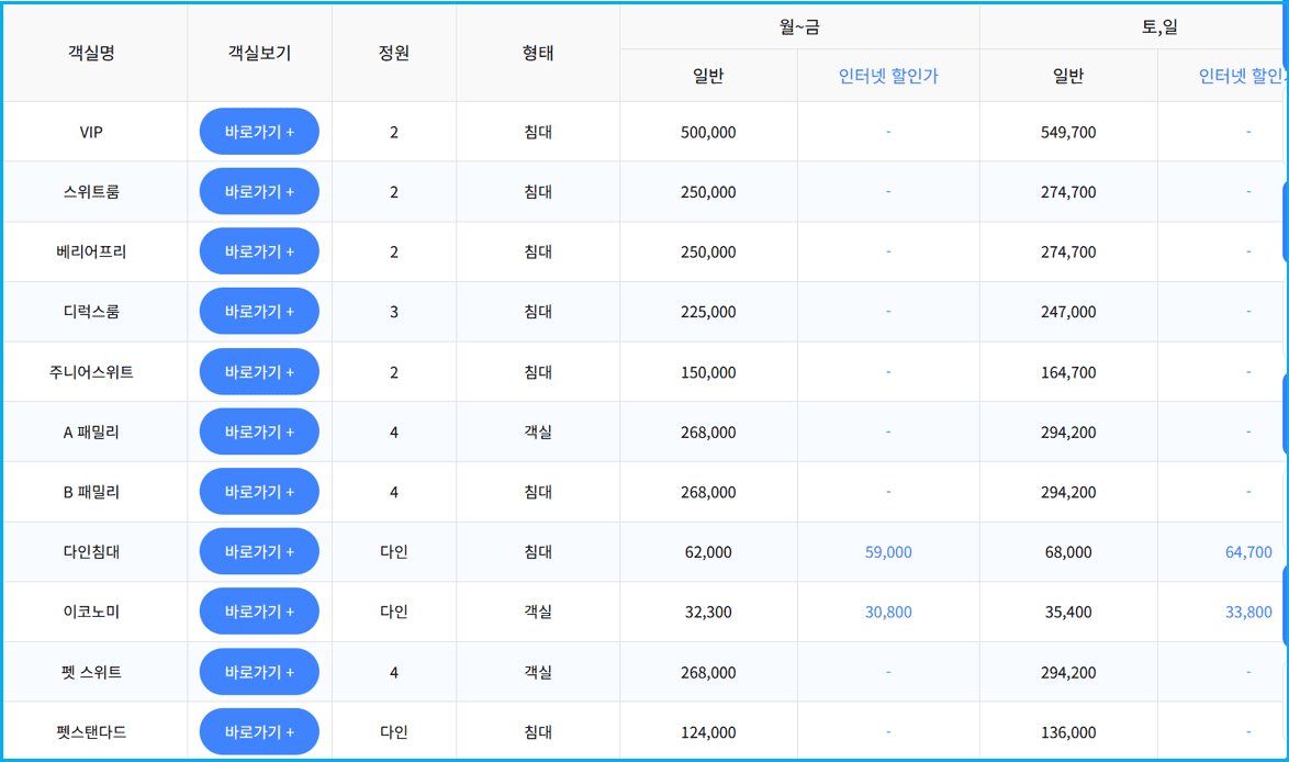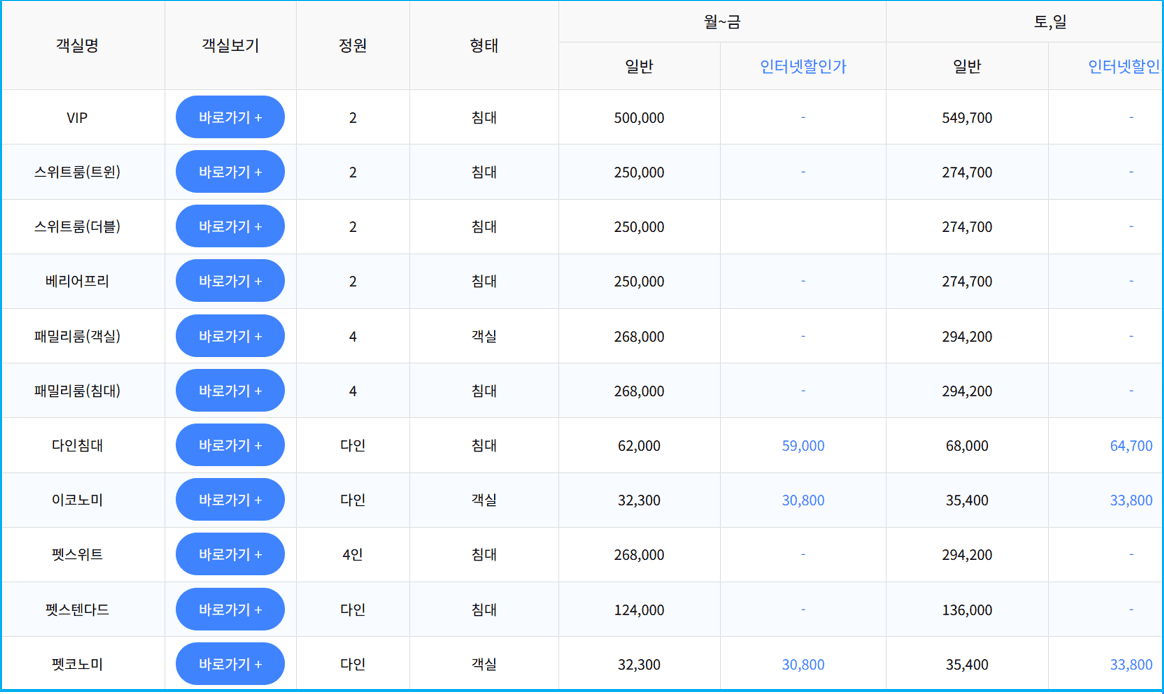 | 펫 스위트 | 정원 4 / ₩268,000 | 동일 | 반려동물 동반 가능 |