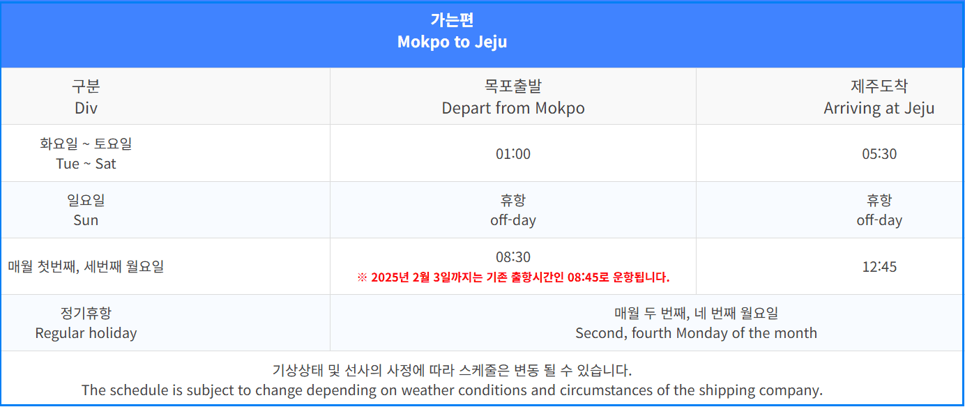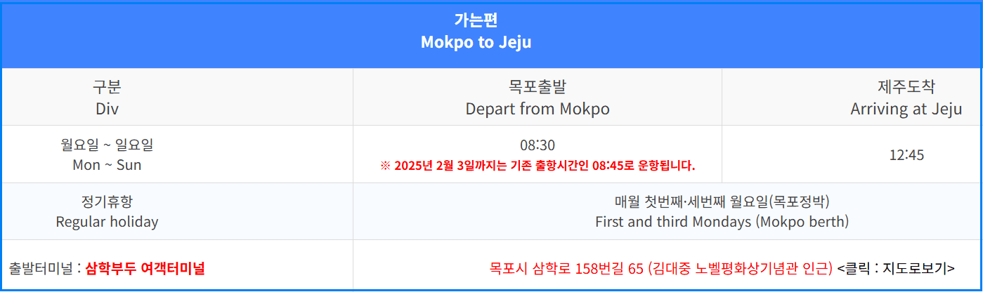 | 가는 편 (목포 → 제주) | 월~일: 08:30 출발 → 12:45 도착 ※ 매월 1, 3번째 월요일 휴항 |