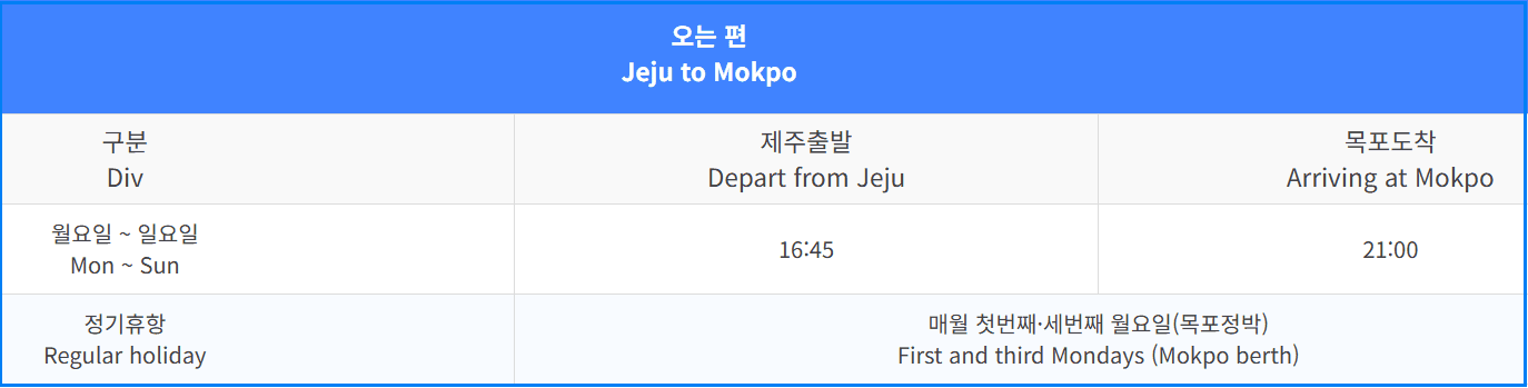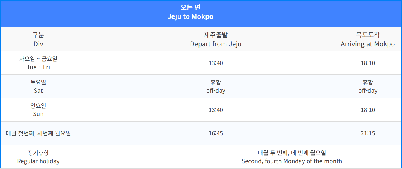 | 오는 편 (제주 → 목포) | 월~일: 16:45 출발 → 21:00 도착 ※ 매월 1, 3번째 월요일 휴항 |