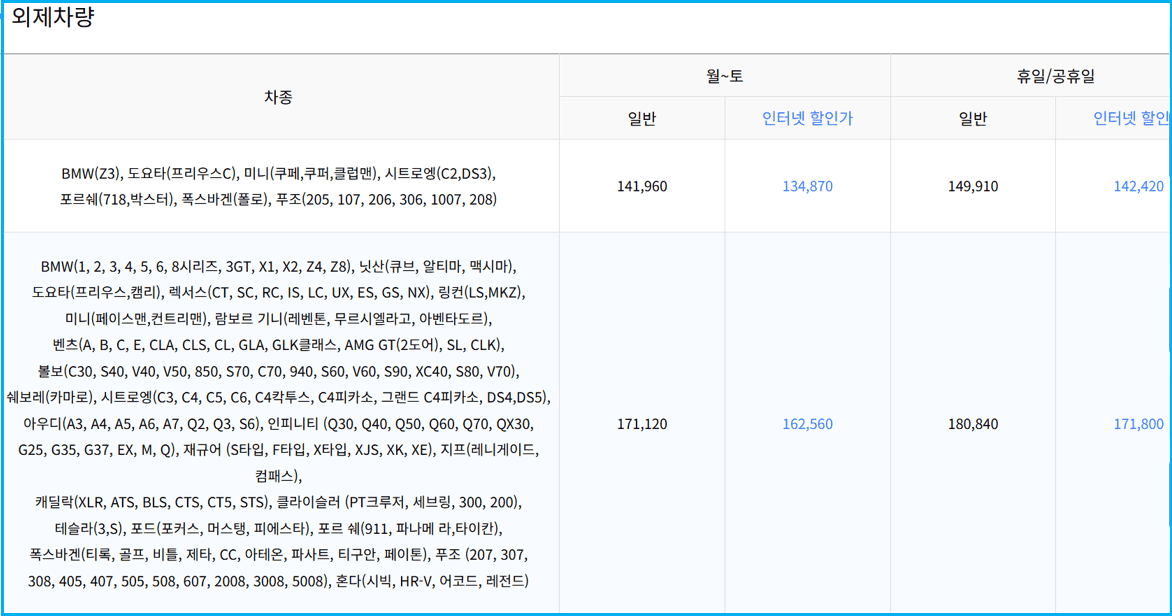 외제차량 요금표