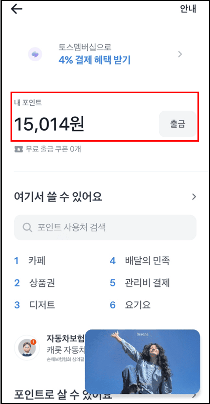 15,014원의 포인트를 바로 현금처럼 출금(다만, 현금 출금시 수수료 10%가 있어서 전 토스페이로 물건 사는 걸 추천드려요!)도 가능하고, 카페, 배달앱, 상품권, 디저트, 관리비 등 다양한 제휴처에서 사용할 수 있어 실용성도 굿!
