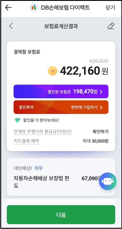 DB손해보험 다이렉트 자동차 보험 가입 절차입니다.( 현재 가입된 자동차 보험이 DB손해보험이라서 따로 입력하는 화면 없이 바로 갱신되는 보험료로 안내가 되고있습니다.)