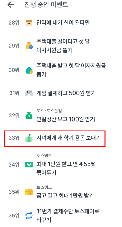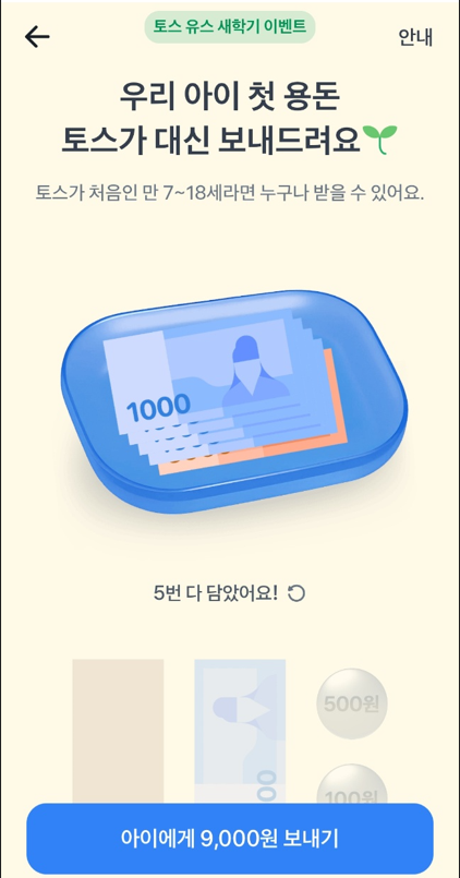 1. 토스에서 [자녀에게 새학기 용돈보내기]이벤트를 검색 2. 다음과 같은 안내 페이지 확인하기