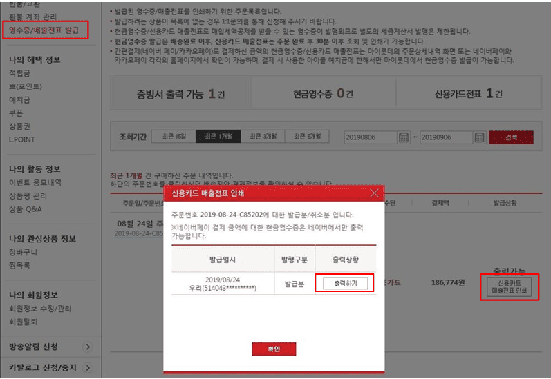 📌 2. 롯데홈쇼핑 카드 영수증(신용카드 매출전표) 출력 방법