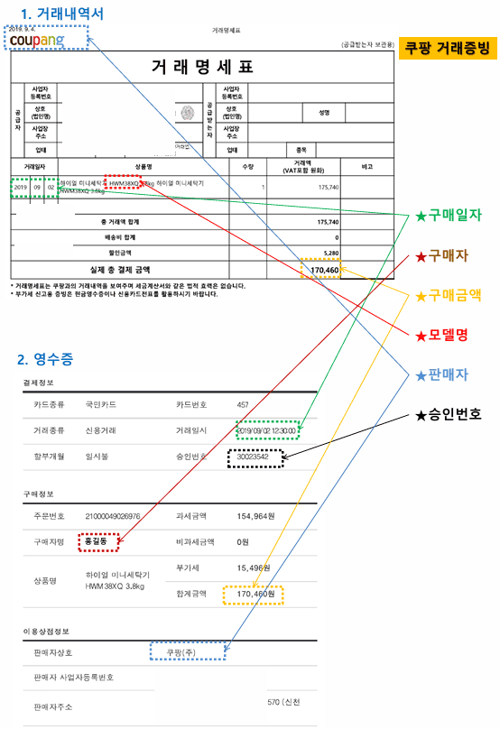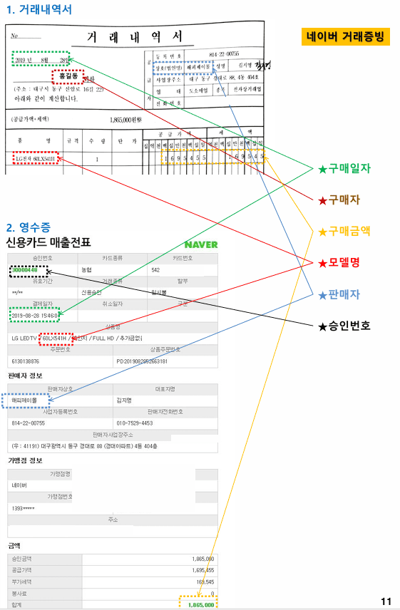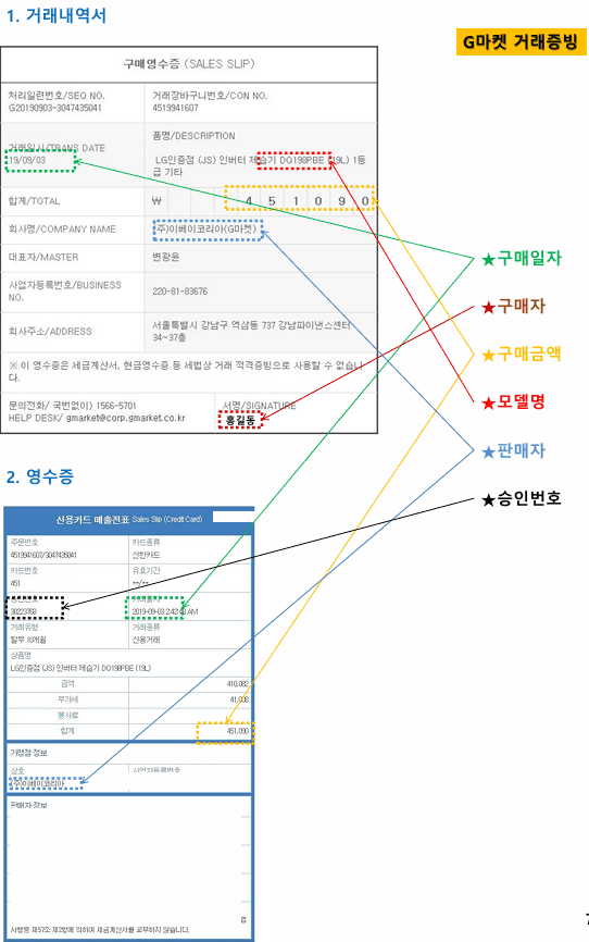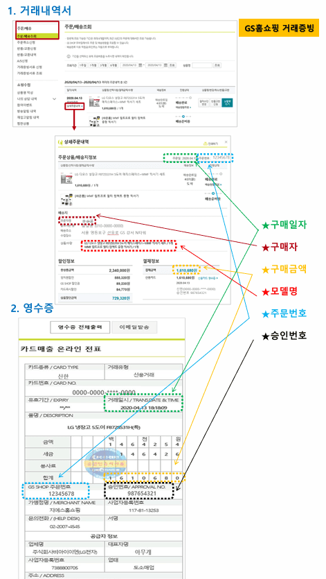 📝 각 사이트에서 화면을 캡쳐할 때는 모델명, 구매자 이름, 결제일자, 결제금액 등이 포함되어야 하며,