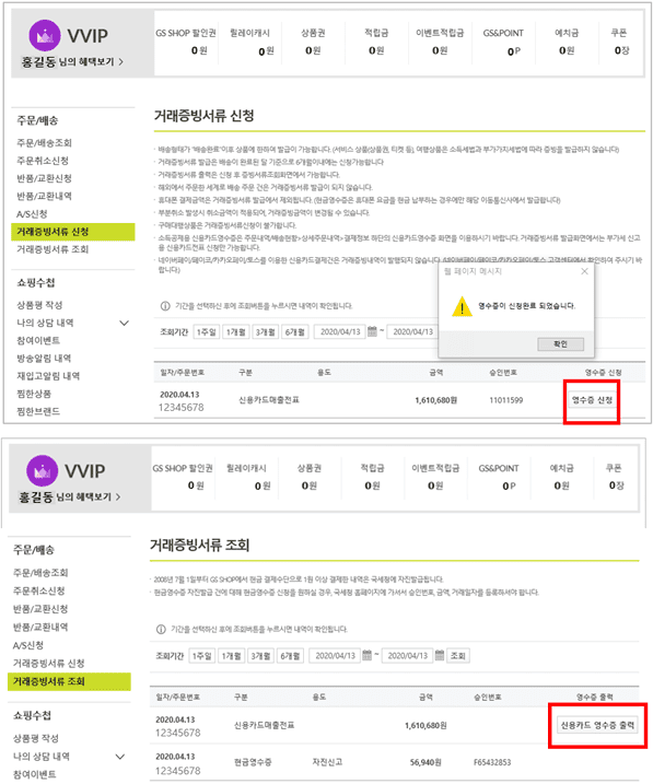 마이쇼핑 → 주문/배송 → 거래증빙서류 신청