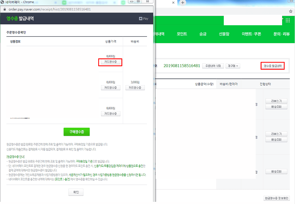 - 방법 2: 동일 페이지 왼쪽 영수증발급내역 → 하단 구매영수증 클릭 후 캡쳐