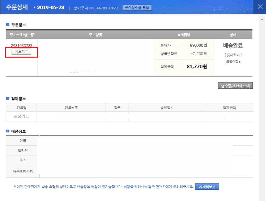 - 방법 1: 나의쇼핑 → 주문내역 → 주문상세보기 클릭 → 상세화면 캡쳐