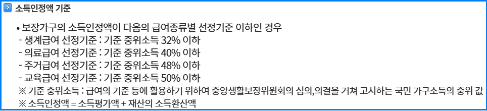 - ✔️ 의료급여 수급 기준: 중위소득 40% 이하