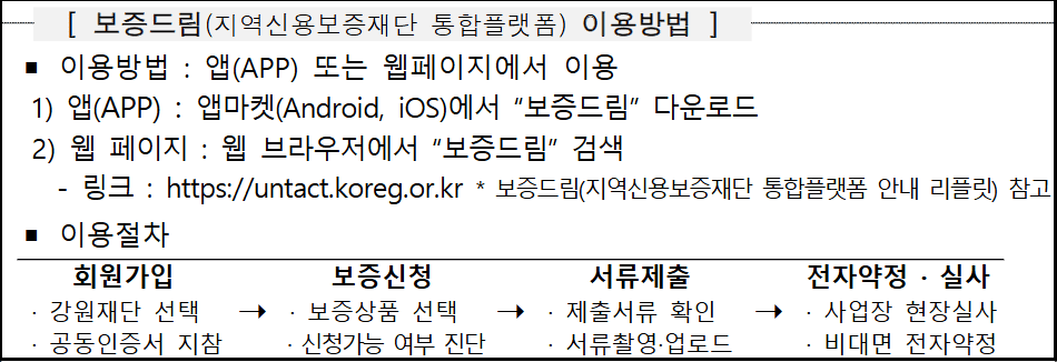 | 신청방법 | 도내 취급은행 영업점 방문 또는 ‘보증드림’ 플랫폼 비대면 신청 | |