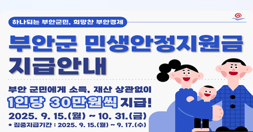 2025년 부안군에서는 군민 모두에게 1인당 30만 원의 민생안정지원금을 지급합니다.