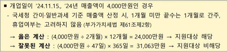 예시: 2024년 11월 15일 개업, 2개월 매출이 4,000만원 → ⇒ 연환산 (4,000만원 ÷ 2개월 × 12개월 = 2.4억 원) → 지원 대상